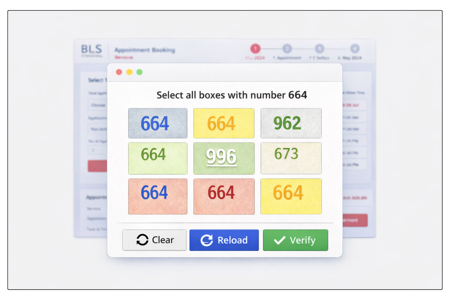 BLS CAPTCHA is a verification step commonly used on BLS appointment and visa-related portals to help prevent automated abuse, spam requests, and excessive bot traffic. It is typically placed before or during important actions such as checking appointment availability, submitting applicant details, or continuing through protected booking workflows.